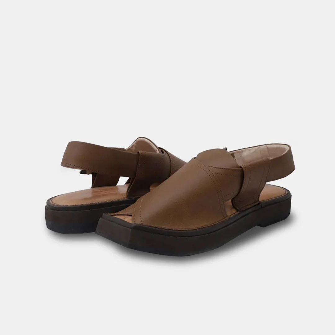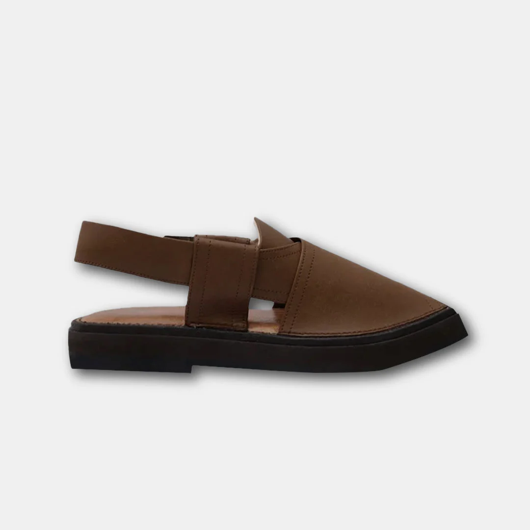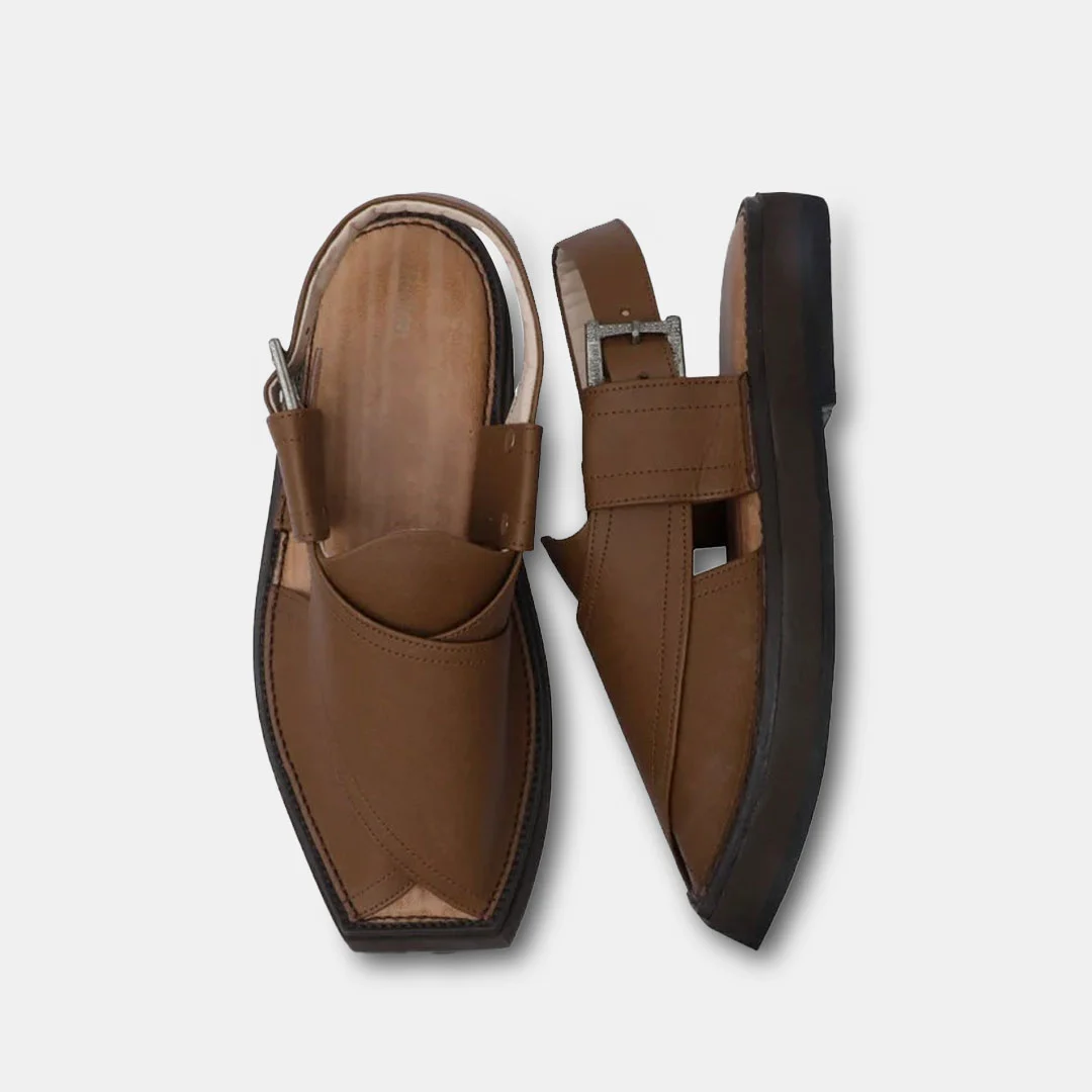 Crafted by skilled artisans from the heart of Khyber Pakhtunkhwa, this Peshawari chappal is made using premium-quality genuine leather, carefully tanned and hand-stitched to ensure long-lasting durability. The rich brown tone reflects elegance and versatility, making it an ideal match for both traditional and semi-formal outfits.